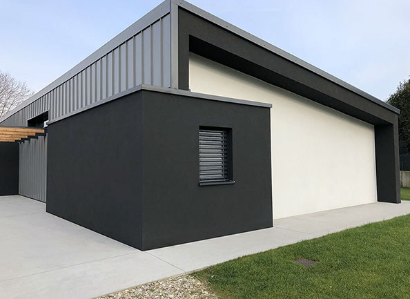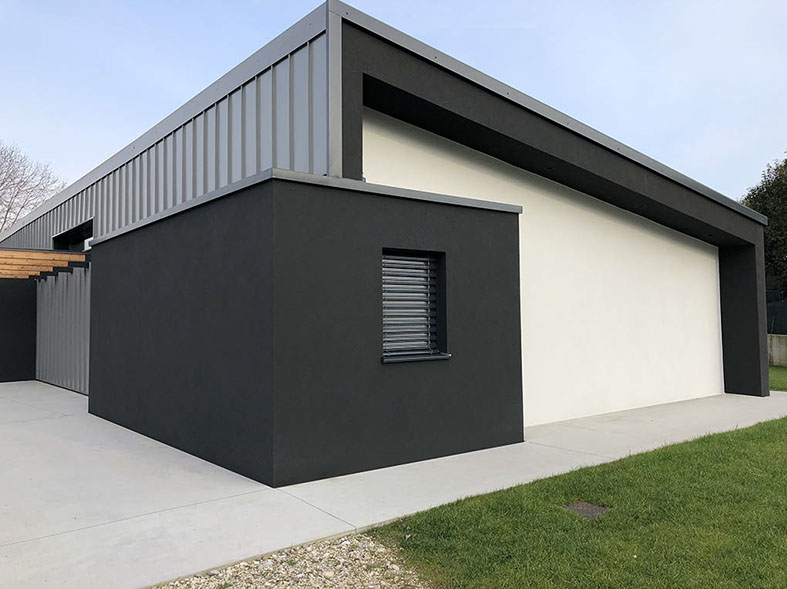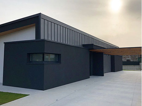 Questa villa unifamiliare dalla pianta geometricamente rigorosa, si erge in un lotto pianeggiante, ma dalla forma complessa ed irregolare. L’esposizione è nord-sud, la facciata Nord, presenta poche aperture, per renderla meno esposta al freddo e nel contempo maggiormente riservata. E’ completamente rivestita da una pelle in alluminio, che dal suolo, si alza su tutta la facciata e continua per completare il tetto inclinato a falda unica.