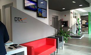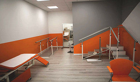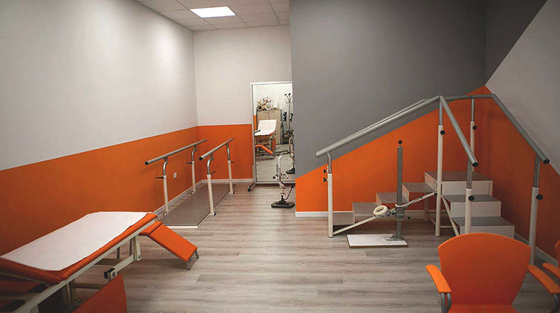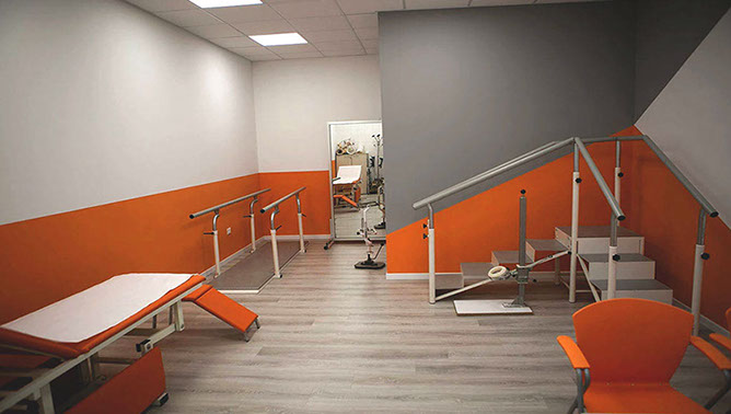 Al primo piano le sale riabilitative, la baropodometria e gli uffici amministrativi. I colori giocano un ruolo fondamentale, le linee si spezzano, ma continuano su tutte le pareti, si confondono, si intrecciano, creando uno spazio dinamico, anche dove non siamo soliti vederlo.