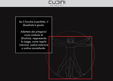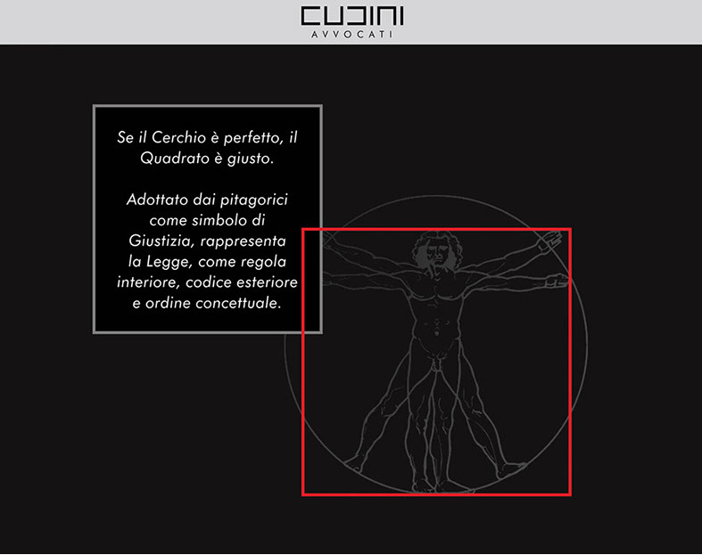 The square, a geometric figure adopted by the Pythagoreans as a symbol of Justice representing the Law, as an interior rule and conceptual order, becomes the matrix, the imprint that generates the logo of the Cudini Associati law firm. The introductory video to the site represents what has just been described.