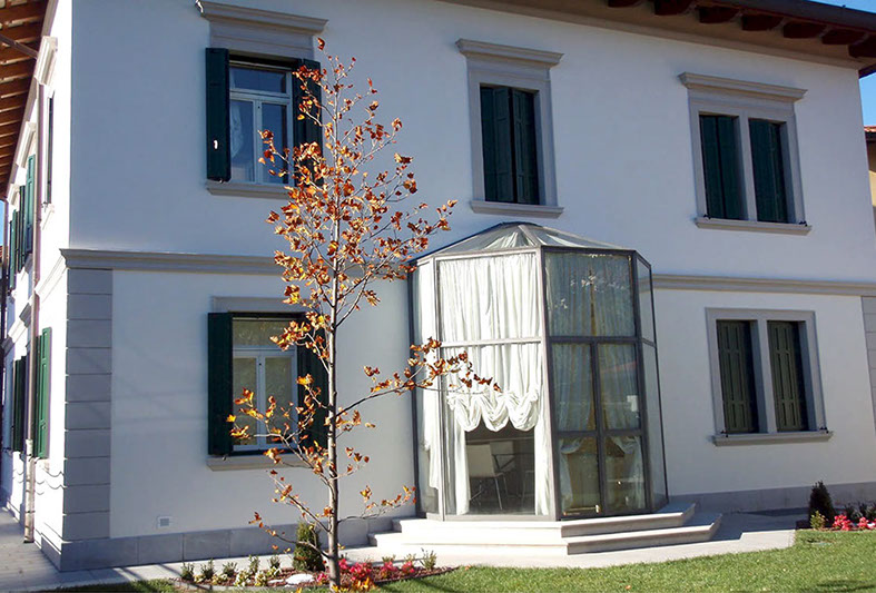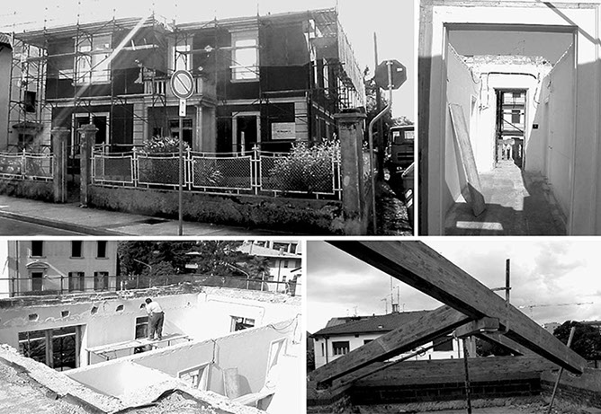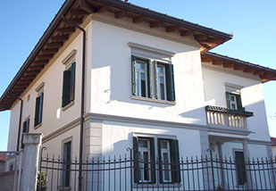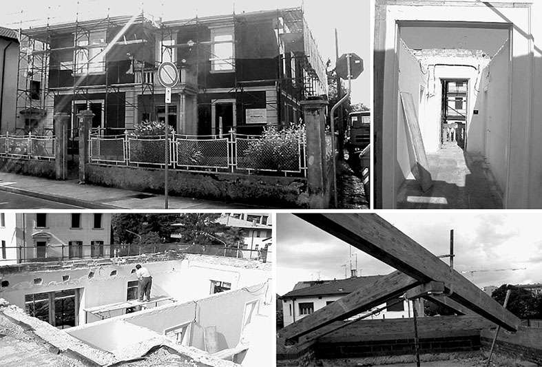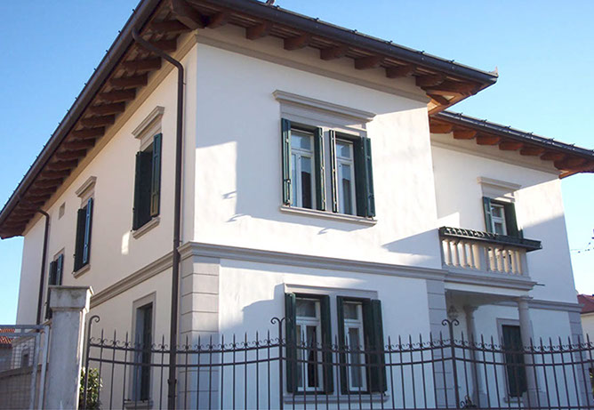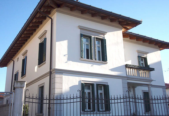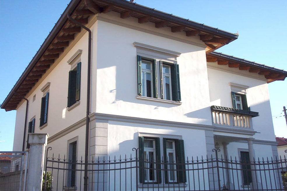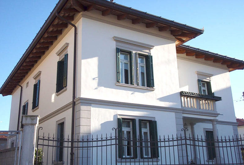 Una villa dei primi del ‘900, divisa in due unità abitative con una superfetazione degli anni ’50, subisce una profonda e completa trasformazione, per renderla una unità singola, risanando nel contempo i solai del piano terra e tutte le pareti, demolendo i solai del piano primo, del sottotetto e della copertura, sopraelevando, per ricavare gli spazi necessari e per omogeneizzare l’unità con l’ampliamento degli anni ’50.