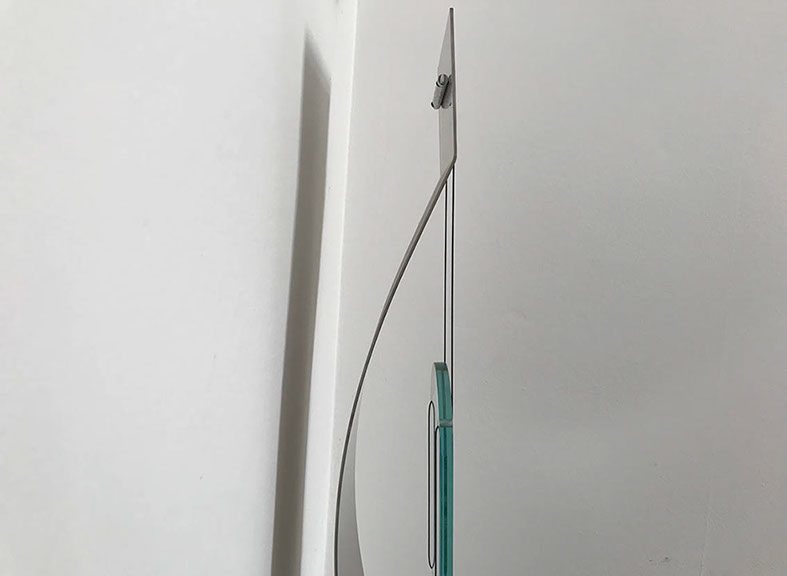 The use of glass for the seat creates a controversial suggestion, given precisely by the formal lightness of this material. Despite its ethereal appearance, the chair remains a chair, and the material used makes it solid and remarkably resistant to loads. The arched steel blade is tensioned by two steel tie rods, which support a glass back. Thanks to the elastic properties of steel, the backrest flexes if stressed, making the seat more "comfortable".