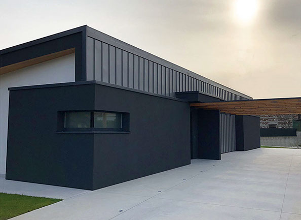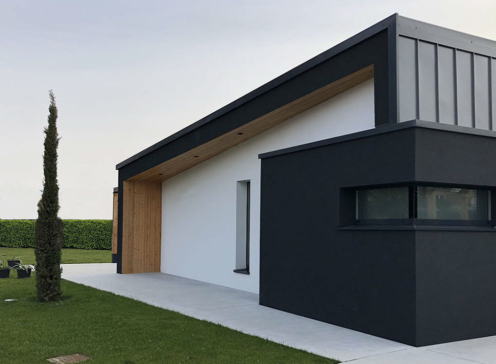Questa villa unifamiliare dalla pianta geometricamente rigorosa, si erge in un lotto pianeggiante, ma dalla forma complessa ed irregolare. L’esposizione è nord-sud, la facciata Nord, presenta poche aperture, per renderla meno esposta al freddo e nel contempo maggiormente riservata. E’ completamente rivestita da una pelle in alluminio, che dal suolo, si alza su tutta la facciata e continua per completare il tetto inclinato a falda unica.