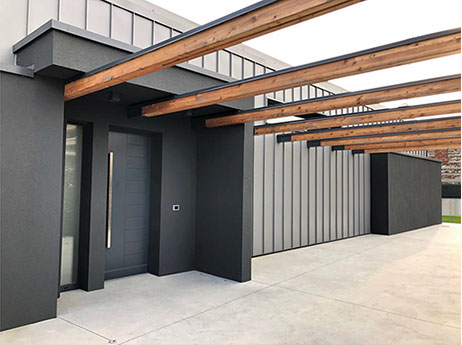 La facciata Sud, si apre invece con ampie vetrate verso il giardino, dove la privacy viene completamente garantita. Si avvale delle più moderne tecnologie e si trova in classe casaclima A.
