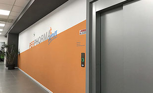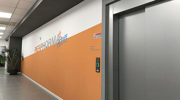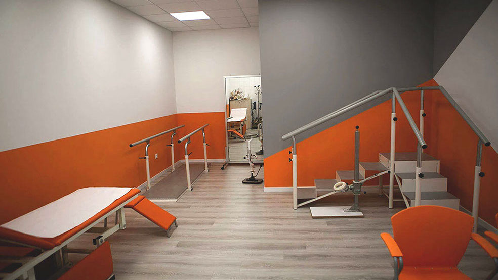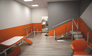 Al primo piano le sale riabilitative, la baropodometria e gli uffici amministrativi. I colori giocano un ruolo fondamentale, le linee si spezzano, ma continuano su tutte le pareti, si confondono, si intrecciano, creando uno spazio dinamico, anche dove non siamo soliti vederlo.