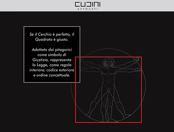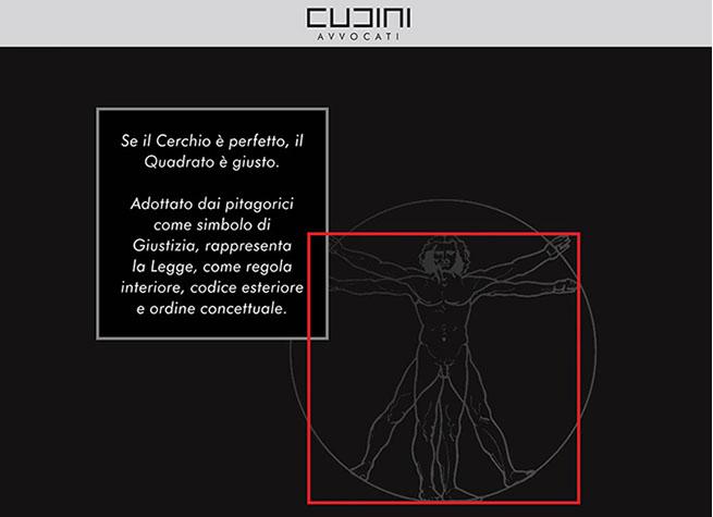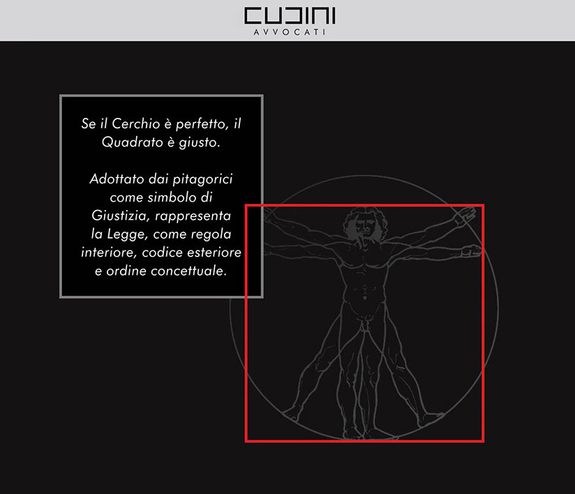 The square, a geometric figure adopted by the Pythagoreans as a symbol of Justice representing the Law, as an interior rule and conceptual order, becomes the matrix, the imprint that generates the logo of the Cudini Associati law firm. The introductory video to the site represents what has just been described.
