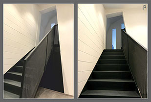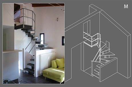 Scala P: i vincoli preesistenti in questa parete, avevano costretto i proprietari ad eseguire una scala stretta e con un foro dall’altezza poco agevole agli uffici direzionali dell’azienda. Proprio questi vincoli diventano spunto per realizzare una scala dall’accentuata prospettiva con un foro inclinato che consente un più facile passaggio, senza dover mettere mano sulle strutture.