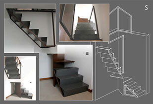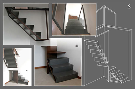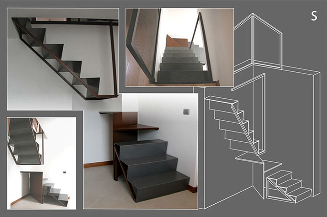 Scala S: questa scala viene divisa in tre parti indipendenti: tre gradini in ferro spazzolato appoggiati al suolo, due fogli di corten per il pianerottolo ed una rampa sospesa, sorretta da elementi in corten, ancorata al solaio. La leggerezza estetica di questa scale viene contrapposta alla sua solidità statica.