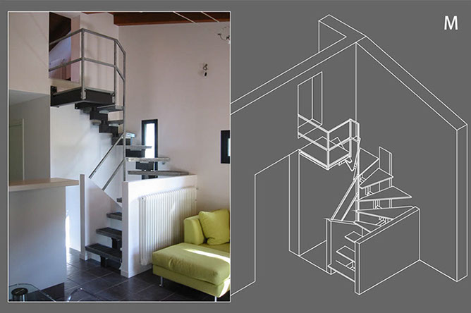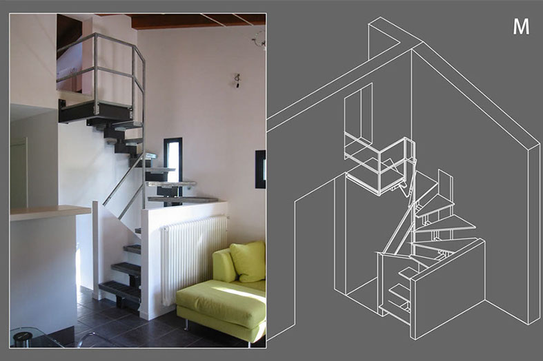 Scala M: the obligatory passage inserted between two beams and the restrictive measures are the binding parameters for the insertion of a staircase that leads to a bedroom.